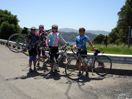 May 7, 2006: The top of Mama Bear with the San Pablo Reservoir behind us. The ladies are Renee Rosado, Anne Hollingsworth, Connie Nelson, and Pat Wai. We only had three more climbs to go to be at the finish!