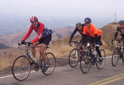 A group comes up the first pitch of Mt. Hamilton Road -- San Jose is in the background. The morning was cool and overcast -- perfect climbing weather. The cloud cover is a high ceiling.