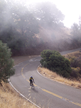 The riders break through the cloud cover near the summit -- the rest of the day would be clear and beautiful. The rider seen here in the distance is Ken Nishimura.