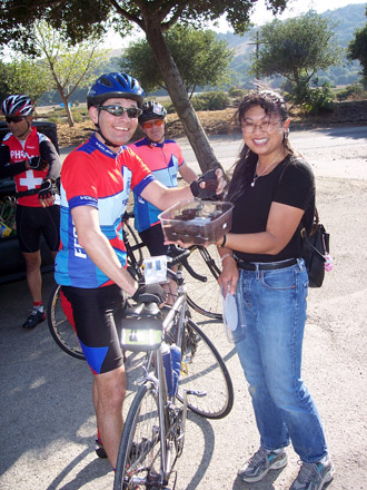 Judy offers snacks to the riders in Sunol. Earlier, Judy also handled a much appreciated snack stop at the bottom of Mines Road. |