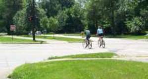 The problem is much worse for those who ride on sidewalks and sidepaths. In the photo at right we see two cyclists who were riding on a multiple-use path in the median strip of a park roadway. The path has a pedestrian "Walk" signal, controlled by a push button. Like most path riders, they did not wait for the signal but rather crossed illegally, dodging turning traffic from the road.