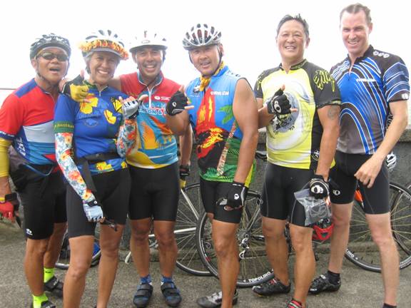 We rode through the Enchanted Lakes area and onto Kalanianaole Highway, where we encountered a steady drizzle. After a couple of miles, we got off the main road and onto some side streets in the Waimanalo area to avoid the speeding traffic, whereupon Joyce rode beside me and commented that she now knew how it felt to swim on her bike. Everyone agreed, however, that it was a warm rain and not unpleasant at all.