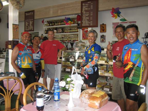 Wednesday, July 11, started very early for 6 cyclists on Oahu. Current Hawaii resident and former FFBC member Phil Lum, his neighbor Tim Shivery, and I met at 6:15am at the Bed and Breakfast home at which my wife and I were staying. We got our bikes ready and headed over to Agnes Bakery to meet Ed & Joyce Tanaka and Ken Lew for our Bakery Ride. Our start was delayed for a while because more adjustments were needed on the bikes they had rented, but we were soon on our way – to the nearest Safeway for a bathroom stop. When Joyce exited the Safeway it was evident that she had been “lei’d” while inside the supermarket.