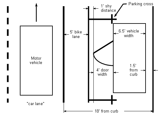 Installing striped bike lanes next to parked vehicles is, at best, a bad practice. If it is done anyway, the space required for parking space and bike lane combined is eighteen feet (see diagram below). The Chicago and Cambridge installations allow only about twelve feet, the minimum that meets AASHTO Guide standards. Other plans have been even worse. A proposed bike lane in Austin Texas would allow only 10 feet including the parking area.