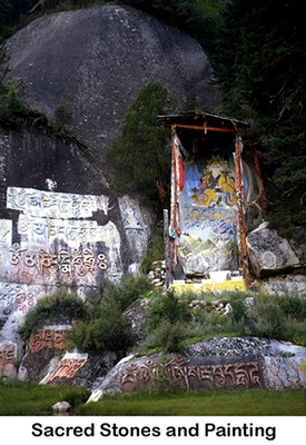 Our pilgrimage started out with a well-marked trail and lots to look at. We came upon large boulders with holy inscriptions carved on them. Other boulders were beautifully painted with both scenes and inscriptions. I had first become aware of such carvings and paintings a few years earlier in Pakistan and later in Bhutan. Those, however, were ancient; these were fresh and new. It was exciting to discover that people were still doing this.