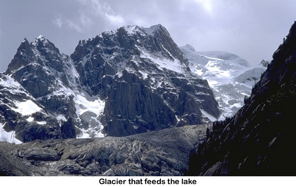 As we came near the far end of the lake, however, things began to change. The trail became thin, broken and hard to follow. Eventually it petered out entirely. At the far end of the lake was a huge glacier and many streams of icy water flowed from it into the lake. Two of those streams were big, rivers really, and we were going to have to cross them. While they were not terribly deep, just about to the top of my knees, they were very swift.