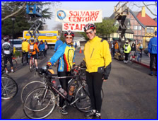 Saturday morning we rolled prior to 8 a.m. We weren’t too anxious to start much earlier as the valley was shrouded in fog and low clouds. The ride out to Lompoc on Santa Rosa Road was crowded with the riders for both the full and half centuries. Soon the skies cleared and so did the course; at mile 25 the half-century riders looped back leaving the century riders to complete our route to Vandenberg, Santa Maria, through Los Olivos and back to Solvang. As with all rides, there were varying degrees of skill, experience and speed. There were several sponsored teams who blew past us with very little etiquette for callouts. Team-In-Training riders had a large contingent that maintained a slower pace with a bit of squirreling up the slight roller hills. Perhaps their aerodynamics were impeded by the cable car ornaments that adorned their helmets. We even rode with tortoise and the hare, and also had a clown up experience passing by a real Bozo!!