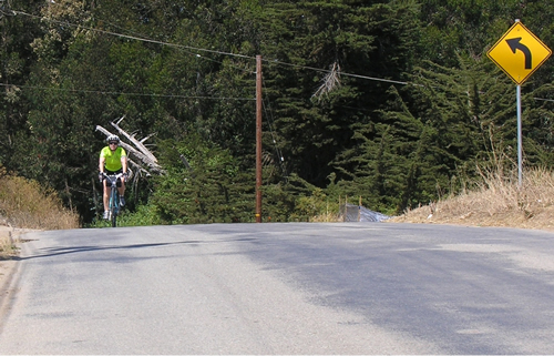 Jan fell in love with this sign thinking it marked the top of yet another long climb. This one turned out to be based on false premises: the real top was still a ways up the road.