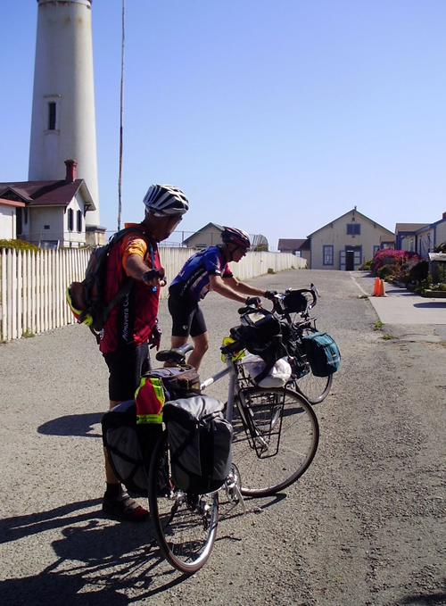 Two really, really old guys arriving at Pigeon Point Lighthouse where we spent our first night.
