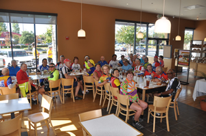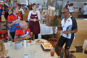 Next, the riders set off on their way to Anderson’s Bakery. The restaurant was full, and the management was very happy to be the destination for the rolling party. After everyone finished their lunches, the bakery surprised the group with a delicious cake that was glowing brightly with candles. Jennifer Shively and Lambert's wife, Gloria, were unavailable to ride that day, but showed up at Anderson’s to pass on more cheer to the Birthday honoree. The hugs and kisses flowed freely towards the guest of honor, and Walt, being Walt, was happy to accept all that were bestowed upon him!