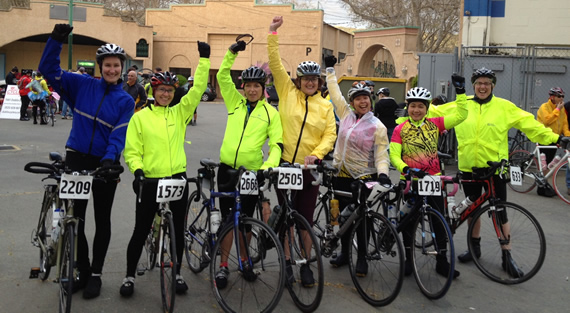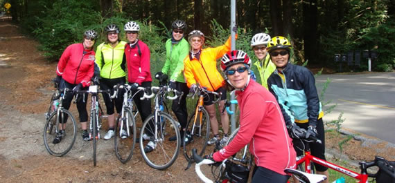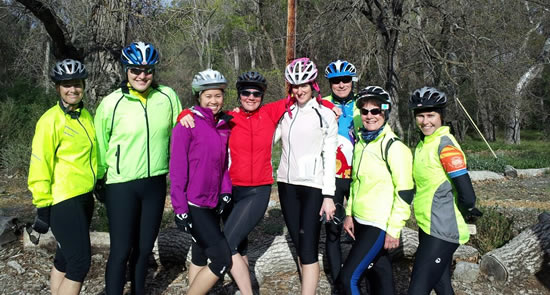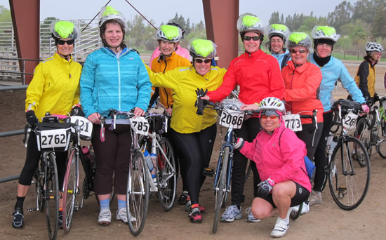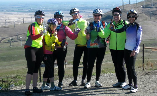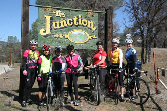 The Hot Tamales made it to the Junction climbing Mines Road. They're smiling now, but little do they know they have a five mile climb to get out of this valley. Tina, Marie, Jackie, Joyce, Leanne, Stephanie, and Tracey