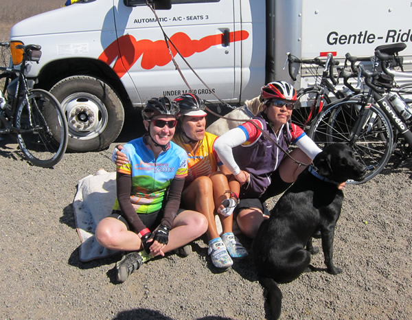 Vanessa, Nancy, and Terri take up resting with 2 labs at Rest Stop Two