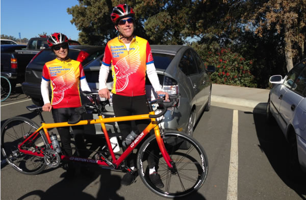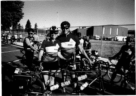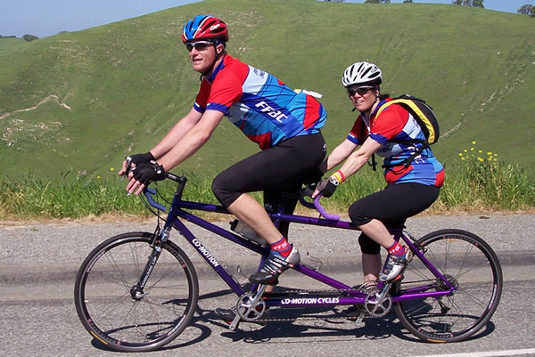 Dan and Susan met and started dating after a FFBC ride led by Molly and Neil Michelfelder. They bought their tandem four months after they were engaged to get married and have now been married nine years. They have had their tandem for ten years now. Susan states that sometimes it is hard to be the stoker, since you release control to the captain!” As for Dan: "Keep pedaling!" He always knows when Susan slacks off. Their rides through the Napa and Dry Creek area are always pleasant and relaxing as they sip a glass of wine here and there along the trip. The hardest ride for them was The Sierra metric century ride starting out of Plymouth, the first year we were married. Susan has very fond memories of their trip to Oregon with several members from the club for the Northwest Tandem Rally. Susan and Dan suggest renting a tandem in order to try it out first. They were hooked the first ride on one. They also bought a used one.