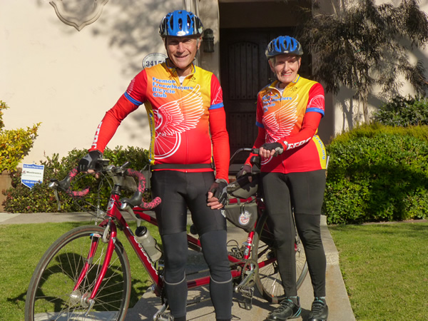 Neil and Molly were married in 1997. Molly hadn’t ridden a bike in 50 years so they bought her a Specialized cross bike, which she rode for about two years. Two falls and many stitches later, they decided a tandem would be best for them. Neil built their first tandem out of two old heavy steel bikes, which they rode for seven years. In 2004 they purchased a beautiful red, Santana Aviva tandem. This is the best of both worlds for Molly. Her responsibilities are to pedal hard, check her rear view mirror for traffic, and look at the scenery. Neil does the hard work (steering, braking, watching out for glass, squirrels, etc.) Neil is a great captain and Molly enjoys being the stoker. They ride to most doctor appointments, shopping, coffee/lunch outings, and club rides. Their true accomplishments were three, six day rides down south-Malibu, Santa Barbara, and San Diego: and one trip North-from Brookings, Oregon to Fort Bragg. The actual destination for the northern trip was San Francisco, but the trip was cut short due to a rainstorm that lasted three days. Molly’s son was their SAG on these rides. Molly shares, “A tandem isn’t for everyone, but for ladies who love to ride, but can’t keep up with the group on their single bikes, and love togetherness, this is the answer!”