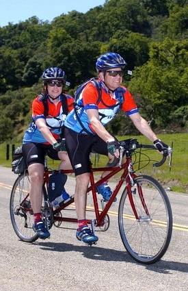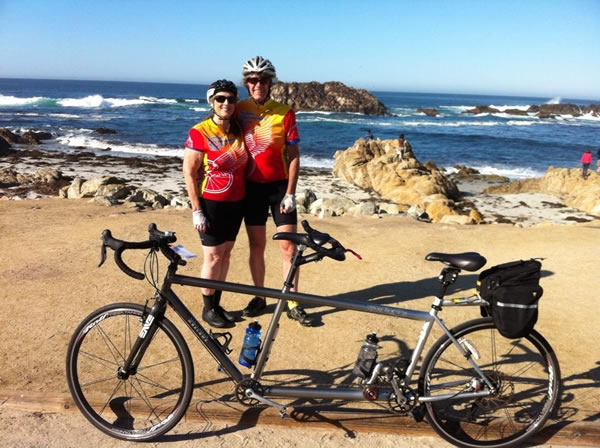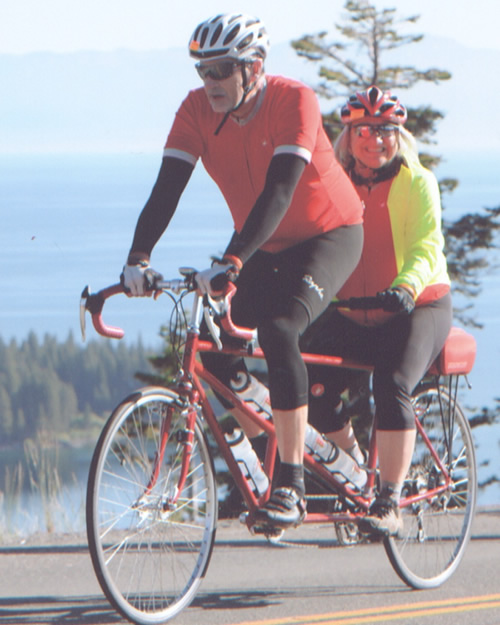 Tim and Robin have been married 33 years. In those years they have owned four tandem bikes. They purchased their first one in 1992 and just bought their fourth one December, after putting over 30,00 miles on their third bike. They’ve ridden on many tandem tours all over the US, Europe, and even New Zealand last year. For them it was an easy transition since Robin enjoyed being a passenger on Tim’s motorcycle. Their favorite local ride is Monterey. Robin's favorite tour was riding along the Mississippi from Memphis to New Orleans, with a paddleboat as a SAG vehicle! Tim’s favorite was riding down the Danube from Prague to Budapest with a cruise ship as SAG. Best advice, keep the rubber side down and try and borrow one or rent one before going out and spending big bucks. Tim says, “They aren't for everybody, but we love ours.”