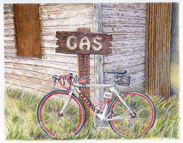 Three years ago I started helping with the Primavera Century event. My background is in art and graphic design, so I’ve had a lot of fun designing the jerseys, posters and other promotional materials for the event. The committee members are all dedicated and hardworking. Each year’s event just keeps getting better and better, and I’m happy to be a part of it. Lately I’ve also been doing more personal artwork, and some of the subject matter relates to my bike and the roads I ride.
