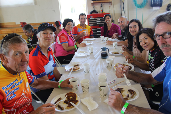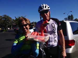 End of 6000 ft of climbing over 60 miles Watermelon served by ride leader Joyce Tanaka