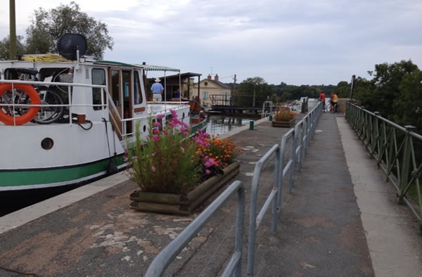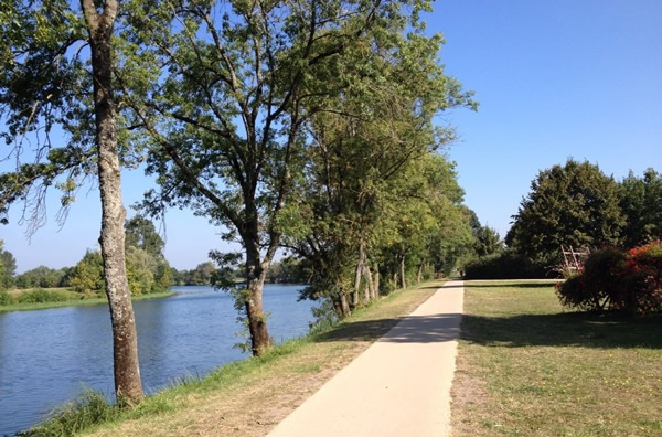 We rode mostly trails and lightly traveled country roads. The road surfaces ranged from blacktop to gravel, but the ride was so pleasant that the surface of the trails were not important - the more rustic the trail the more pleasant the ride. We did run into some heavy traffic in a few of the larger cities we traveled through, but the drivers in France are very respectful of riders. The trails were just delightful, and we found as we were taking pictures of the pleasant surroundings, the pictures were getting repetitious as everywhere we looked there was another photo opportunity. At times we would see canoes, kayaks or working-boats on the river. Sometimes we traveled close enough to the river you could chuck a soft croissant into it, but we would never waste a croissant. Fishermen sat on the banks lazily waiting for a bite. Traveling along the canals, we rode beside pleasure boats, watched them navigate flower adorned locks, or passed by harbors filled with many types of boats. At the locks, we would stop and talk with the boaters as they were raised or lowered to the next level. And of course there was usually a café close by which would invite us to have an espresso, lunch or ice cream.