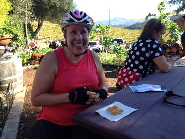 The key to a successful Chris King Gourmet Century ride is pacing, and I don’t mean on the bike, I mean on the food front. If you eat too much at the rest stops the next few miles are pretty ugly. After a big breakfast we really weren’t ready for much at the first rest stop but it was hard to resist the little squares of pastry filled with curried squash. Pictured above is Paula Thompson showing amazing restraint! :-)