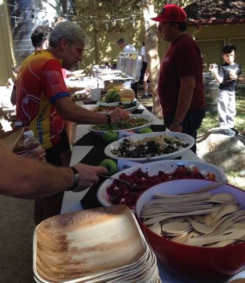 Next up was lunch (after peddling a few more miles). What a feast! Amazing will power was needed to refrain from piling your plate high with delicious salads, curried squash and various BBQ’d meats. In the picture above Jay Gilson samples the offerings.